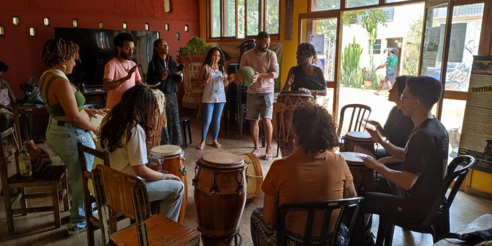 Fundada em 2005 em Perus, a Comunidade Cultural Quilombaque é um coletivo que se estabelece como um Quilombo Cultural. O nome “Quilombaque” reflete sua essência: “Quilombo” em referência aos espaços de resistência e preservação de tradições, e “Baque”, que evoca a batida ancestral do tambor, nossa energia vital que conecta a força dos ancestrais e à natureza.